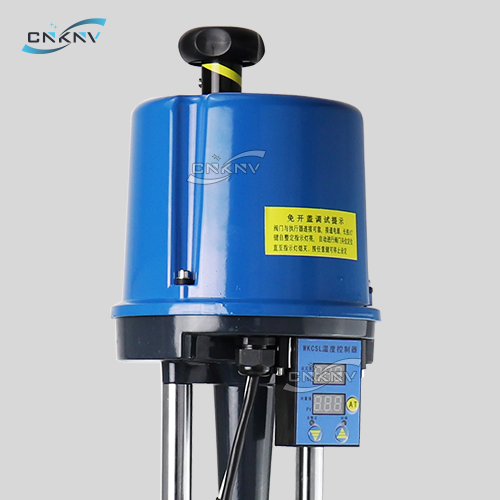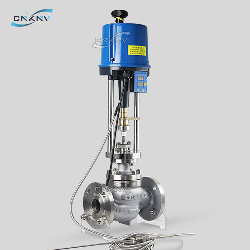 克诺阀门生产的电控温度调节阀工作前主阀芯处于半开位置,传感器处于自然状态。接上电源后,主阀芯全开。介质由箭头方向流入主阀体、经阀芯对储热箱进行加热。当温度高于设定值时,传感器即产生相应线性信号输入电动执行机构产生一个轴向动作,带动阀杆、阀芯产生直线位移,关闭主阀芯停止加热。电控温度调节阀工作中温度低于设定值时,传感器同样产生相应线性信号输入电动执行机构,驱使阀芯打开,使介质按抛物线特性流入储热箱,进行加热直至设定值。反复循环,使被控介质温度始终保持在设定范围内,从而达到自动控制的目的,这就是电控温度调节阀的工作原理。